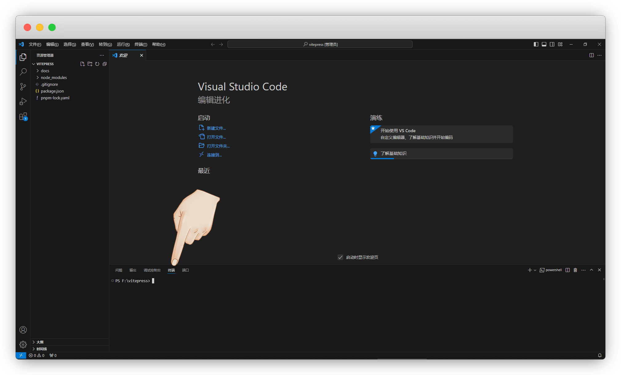 然后按 Ctrl+`(~) 键 (ESC下面的那个键),调出终端,正式开始开发