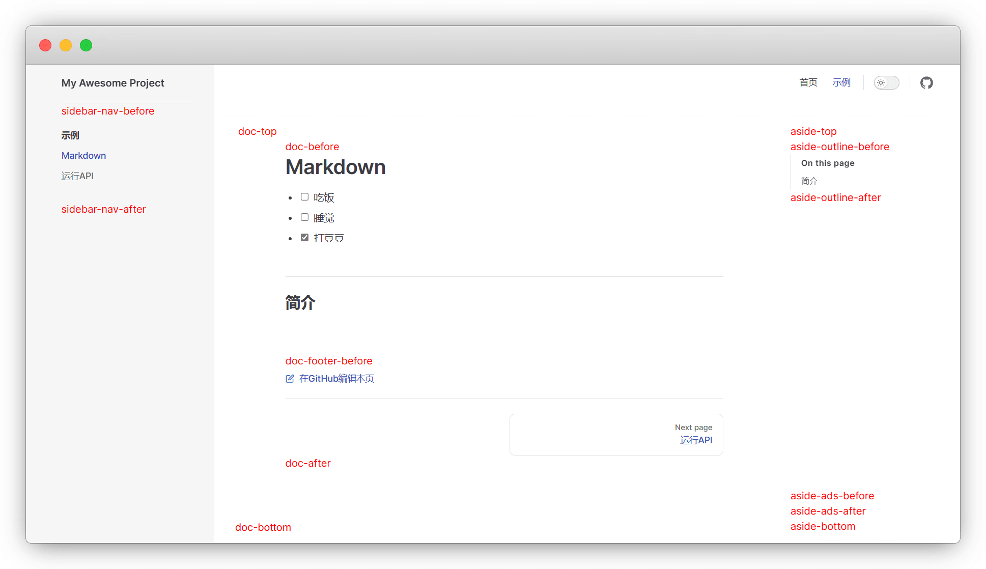 当 Frontmatter 配置 layout: doc (默认)时插槽及位置