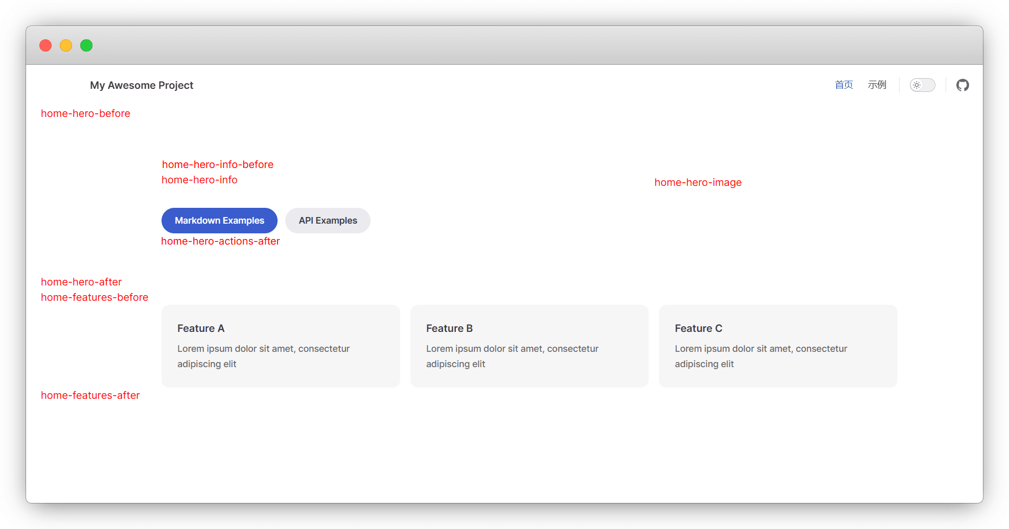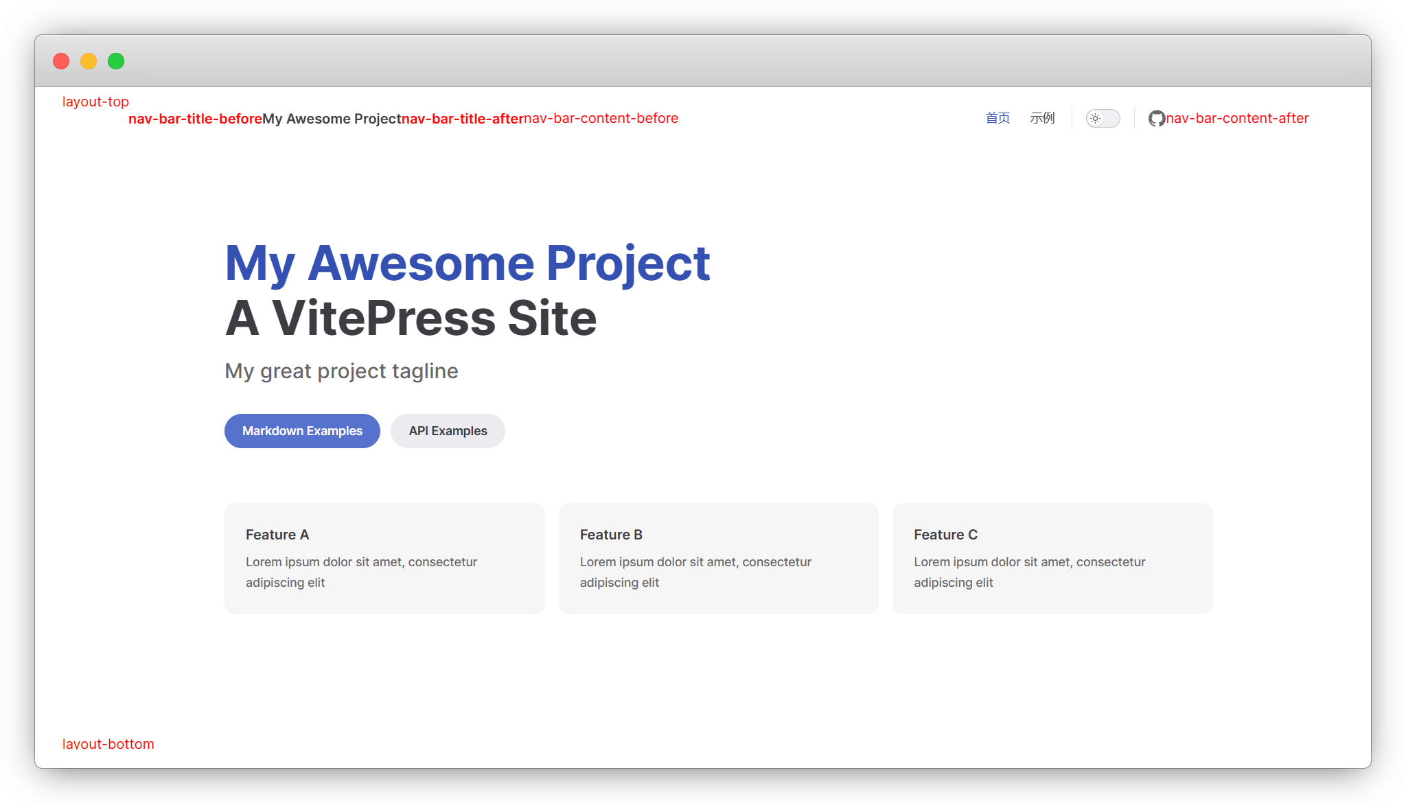 Vitepress基于Vue3用到了 <slot> 插槽,在 <Layout/> 布局组件中预留了一些插槽,可以对页面布局进行自定义修改